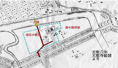 重なる水害にも水がつかない一等地であった。最初は畑として作物や桑の木が植えられていたようである。